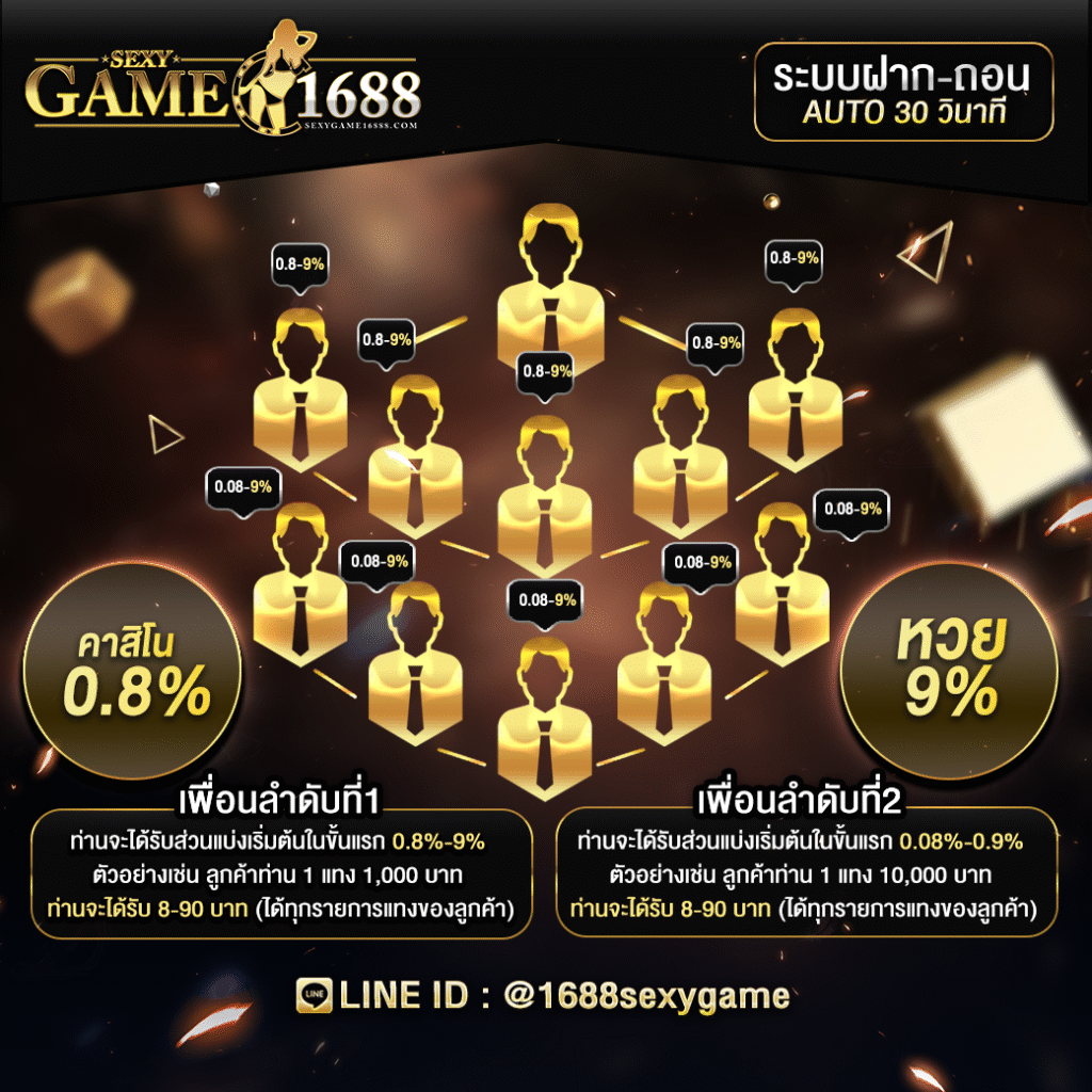 ท่านจะได้รับ 0.8% ยอดเทิร์นโอเวอร์ เมื่อผู้ที่สมัครผ่านลิ้งค์ของท่านเข้าเล่น